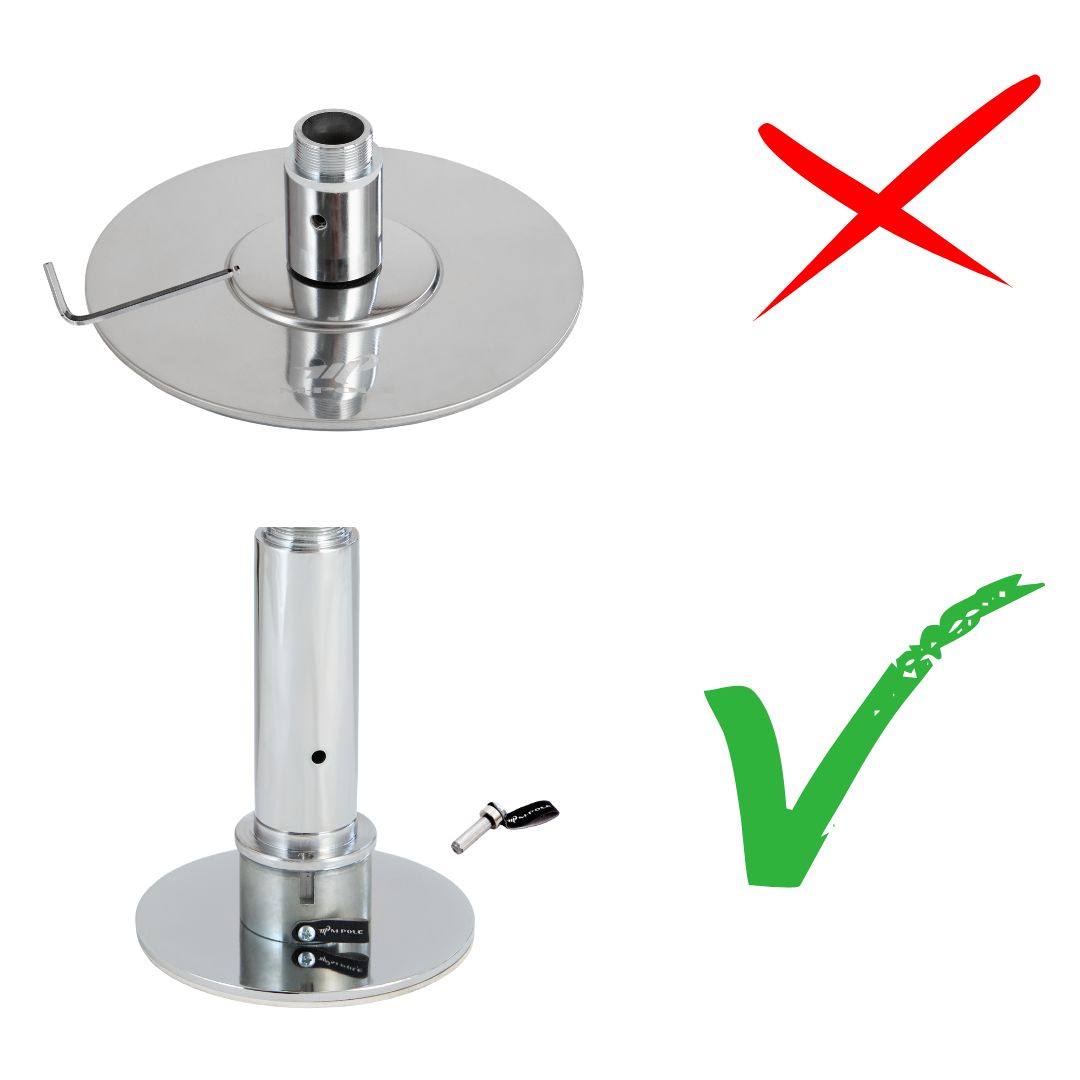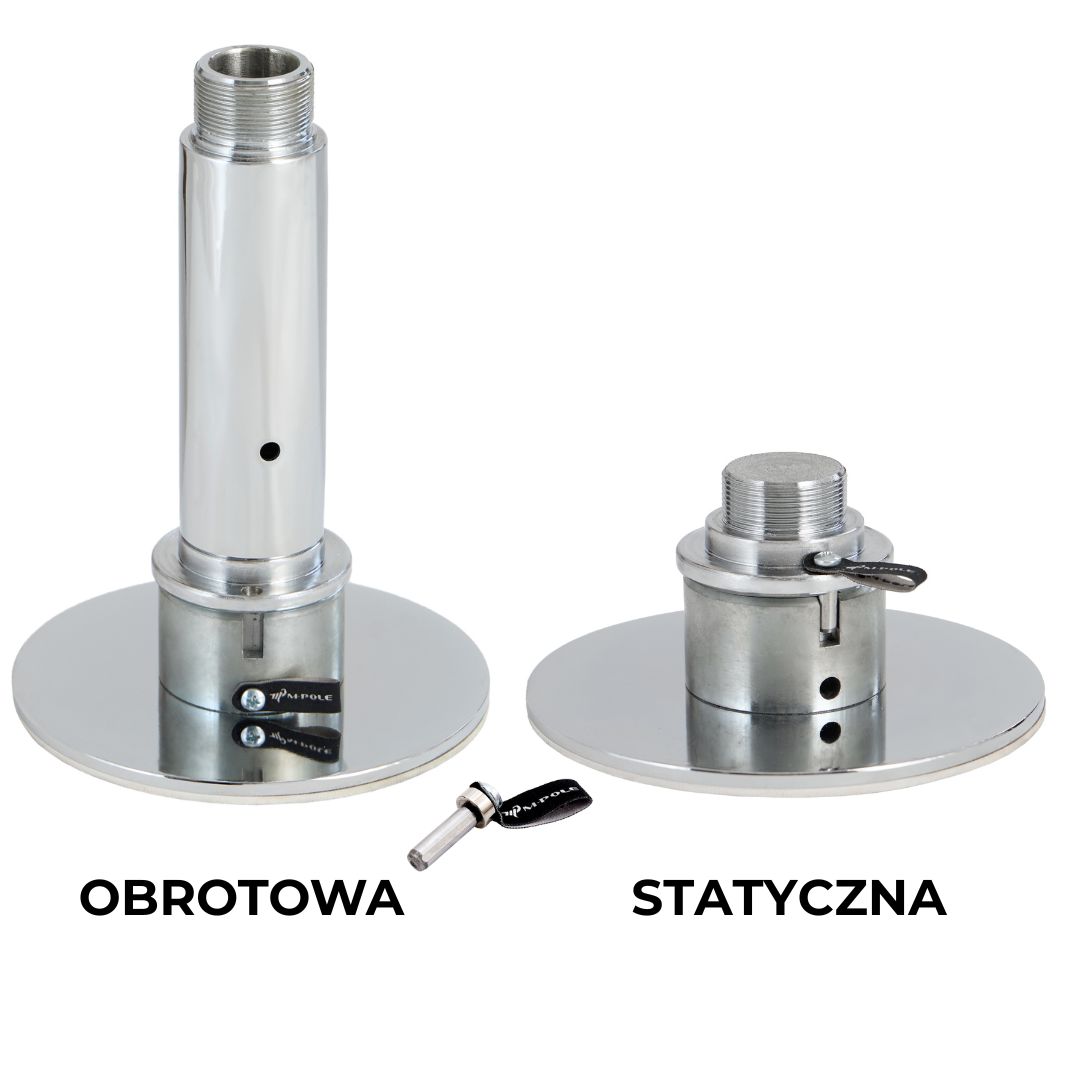 Największa różnica jest w konstrukcji podstaw i mechanizmie zmiany trybu. W tanich rurach tryb spin/statyk zmienia się śrubką, której gwint z czasem się wyrabia. W tym modelu zastosowany jest pin, który jest mniej awaryjny i stabilniejszy w długim użytkowaniu. Dodatkowo górny talerz ma łożysko wahliwe, które lepiej dopasowuje się do sufitu, a same podstawy są podobne do tych z rur profesjonalnych do szkół.