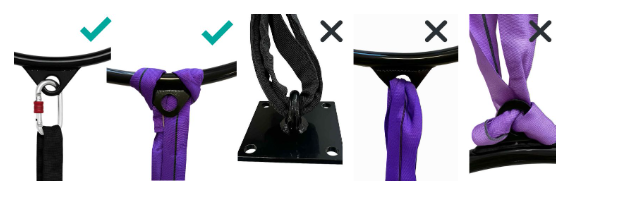 Najbezpieczniejszym rozwiązaniem jest montaż zawiesia lub daisy chain za pomocą karabinka. Pamiętaj o regularnym sprawdzaniu stanu sprzętu przed każdym treningiem.